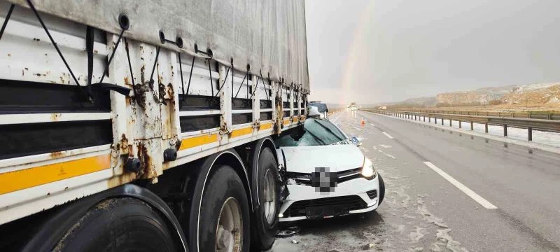 Sivas’ın Şarkışla ilçesi Elmalı köyü yakınlarında dolu yağışının ardından kayganlaşan yolda otomobilin tırın altına girdiği kazada sürücü yaralandı.
