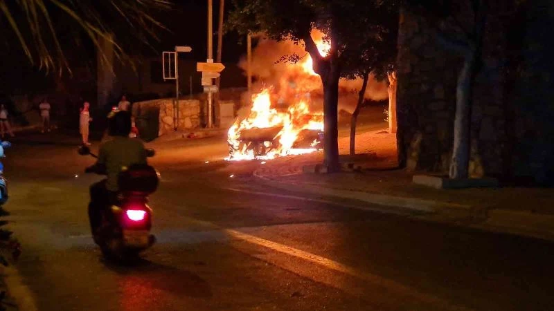 Muğla’nın Bodrum ilçesinde seyir halindeyken yanmaya başlayan otomobil alev topuna döndü. Zaman zaman patlamaların yaşandığı araç, tamamen yanarak kullanılamaz hale geldi.