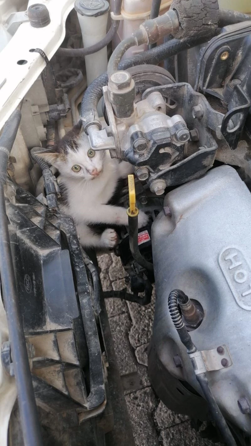 Tokat’ta bir otomobilin motor kısmında sıkışan yavru kedi itfaiye ekipleri tarafından kurtarıldı.