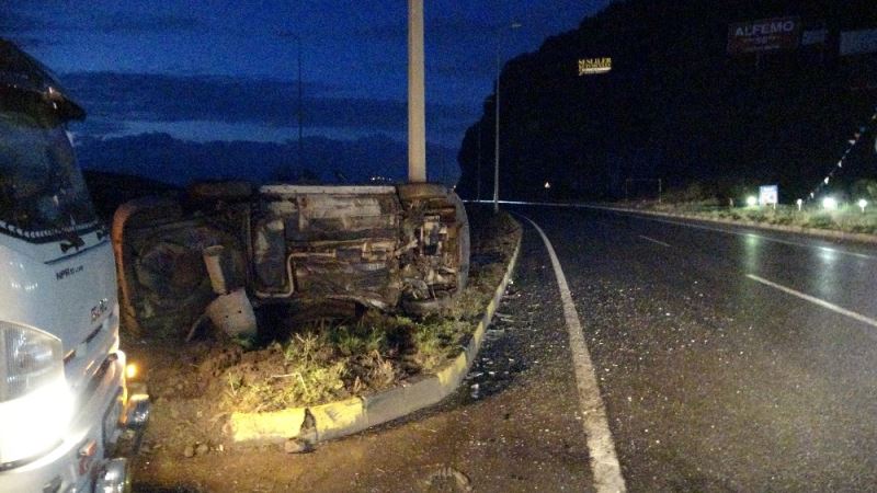 Zonguldak’ın Ereğli ilçesinde 2 araç kafa kafaya çarpışırken, takla atan araç elektrik direğine çarparak durabildi.