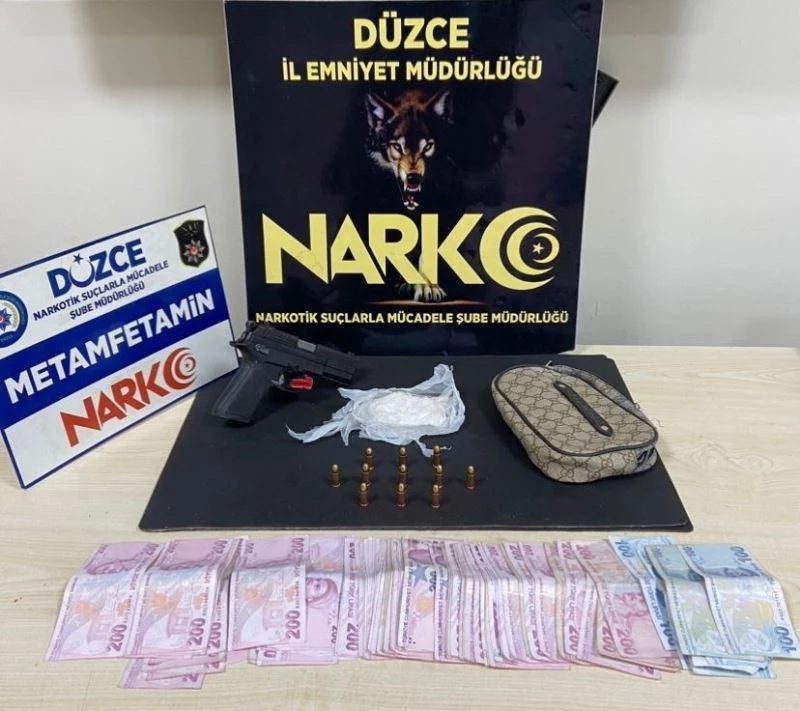 Düzce Narkotik Suçlarla Mücadele Şube Müdürlüğünce yürütülen çalışmalarda, Ankara-İstanbul otoyolunda şüphelenilerek durdurulan İstanbul plakalı araçta ve araçta bulunan M.Ü. ve E.K. isimli şahısların üzerinde yapılan aramada 101 gram metamfetamin, 1 adet silah ve silaha ait 11 fişek, suçtan elde edildiği değerlendirilen 23 bin lira ele geçirildi. Şüpheliler uyuşturucu madde ticareti yapmak suçundan gözaltına alındı.