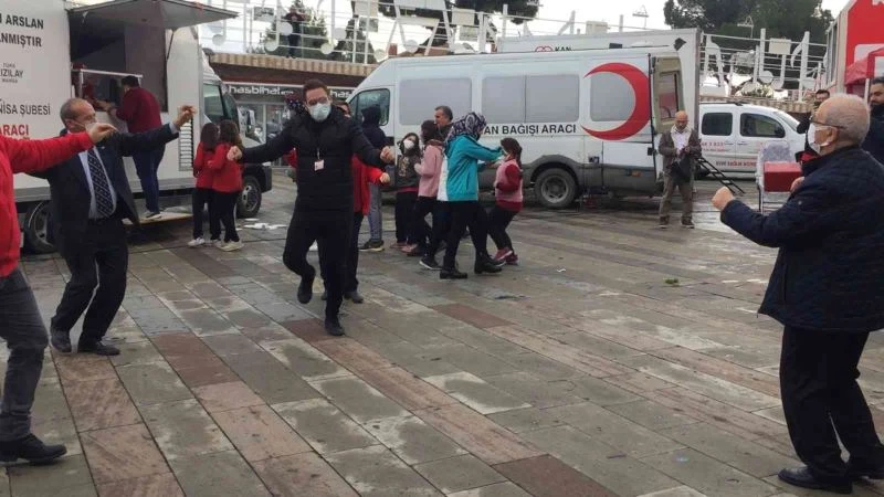 Manisa’nın Alaşehir ilçesinde Manisa Kızılay Kan Merkezi Müdürlüğü tarafından düzenlenen kan bağışı kampanyası yoğun ilgi görüyor. Cumhuriyet Meydanı’nda kurulan çadırlar ve gezici mobil kan alma merkezinde çalan müziklere dayanamayan bazı vatandaşlar önce Kızılay ekipleri ile karşılıklı oynadı, ardından da kan bağışında bulundu.