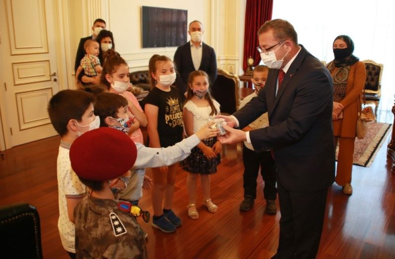 Yozgat Valisi Ziya Polat, Mehmetçik Vakfına yardım amacıyla kullanılabilir durumdaki oyuncaklarını satışa çıkartan çocukları makamında kabul edip, tebrik etti.