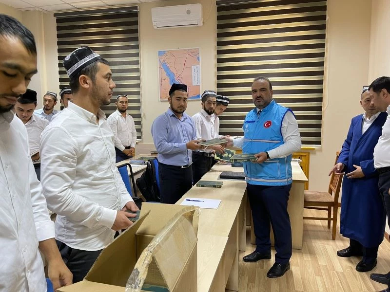 Türkiye’de bastırılarak Özbekistan’a ulaştırılan Kur’an-ı Kerimler, Diyanet İşleri Başkanlığı Dini Yayınlar Genel Müdürü Doç. Dr. Fatih Kurt ve Dış İlişkiler Genel Müdürlüğü Yurtdışı Türkler Daire Başkanı Suat Okuyan’ın katılımıyla medrese eğitimi gören öğrenciler başta olmak üzere ihtiyaç duyulan bölgelerdeki vatandaşlara dağıtıldı.