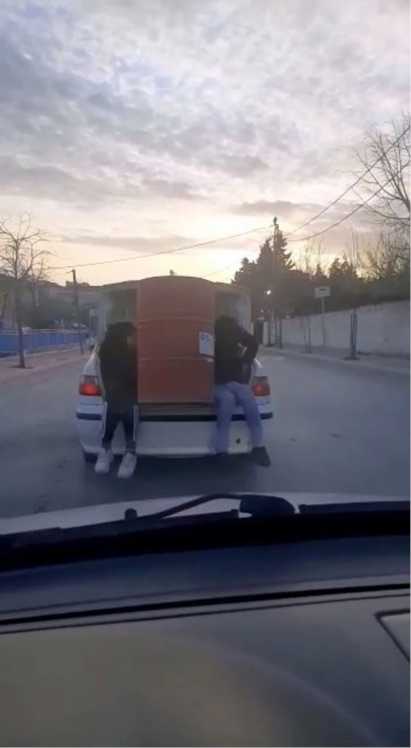 Arnavutköy’de aracına sığmayan varili kapağı açık bırakılan bagaja koyan vatandaşın, taşınma yöntemi bu kadar da olmaz dedirtti. Varili tutması için iki çocuk da bagaja oturttulurken, tehlikeli taşımacılık anbean cep telefonu kameralarına yansıdı.