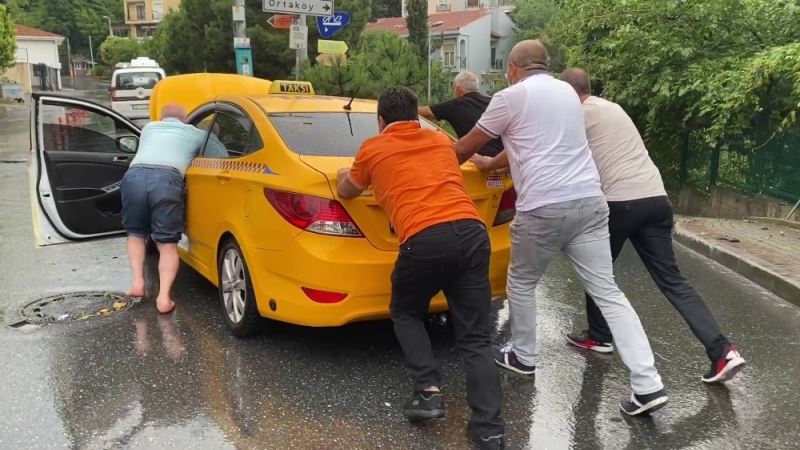Şiddetli yağmur nedeniyle Beşiktaş’da göle dönen sokakta ticari taksi mahsur kaldı. Taksiden inen sürücü ve yabancı uyruklu müşterisi aracı iterek sudan kurtardı. Taksi şoförü, "Aldık yolda çıkamadık. Müşteri ile birlikte arabayı ittik. Bu belediyenin çalışmaması. Burada bulunan iki yeri açmıyorlar" dedi.