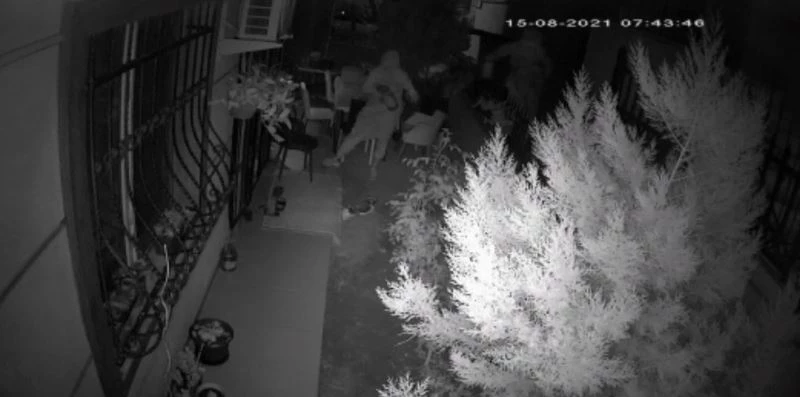 Hırsızlardan biri evin bahçesine girerken bir hırsız ise sokakta bekleyerek etrafı gözetledi. Değerli bir şey göremeyen hırsızlar masada duran yer fıstığını ve 4 bidon turşuyu alıp kayıplara karıştı. Hırsızlık anı ise güvenlik kamerasına saniye saniye yansıdı.