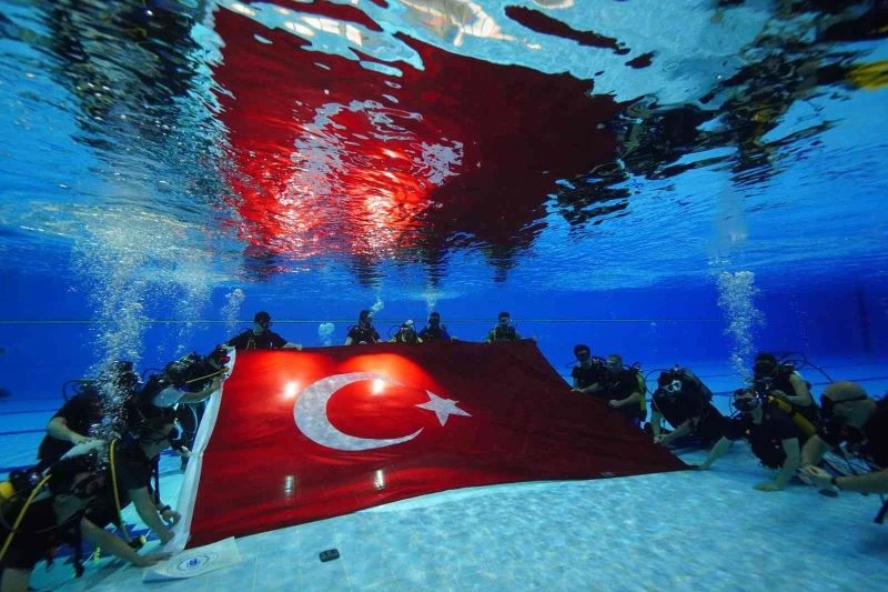 Kocaeli’nin Gebze ilçesinde dalış yapma heyecanı yaşayan özel bireyler, havuzun altında ay yıldızlı Türk bayrağını dalgalandırdı.