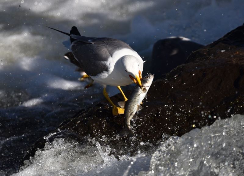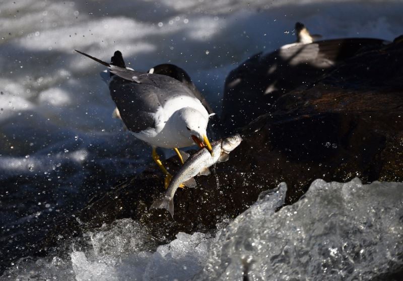 Dünyada sadece Van Gölü’nde yaşayan ve üreme döneminde tatlı sulara göç eden inci kefalinin engel tanımayan muhteşem yolculuğu devam ederken, martılar ise rahatça ulaştıkları avlarını gökten süzerek kapma yarışına giriyor.