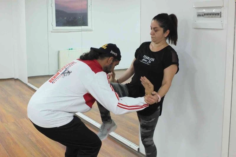 Balıkesir’in Bandırma ilçesinde açılan kursa katılan kadınlar yolda ya da kapalı alanlarda kendilerine yönelik kapkaç ya da şiddet olaylarına karşı nasıl savunacaklarını öğreniyor.