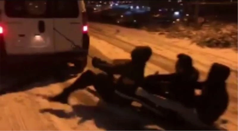 Arnavutköy’de akşam saatlerinde kar yağışının etkisiyle buzlanan yolda kaymak isteyen gençlerin yöntemi yürekleri ağza getirdi.