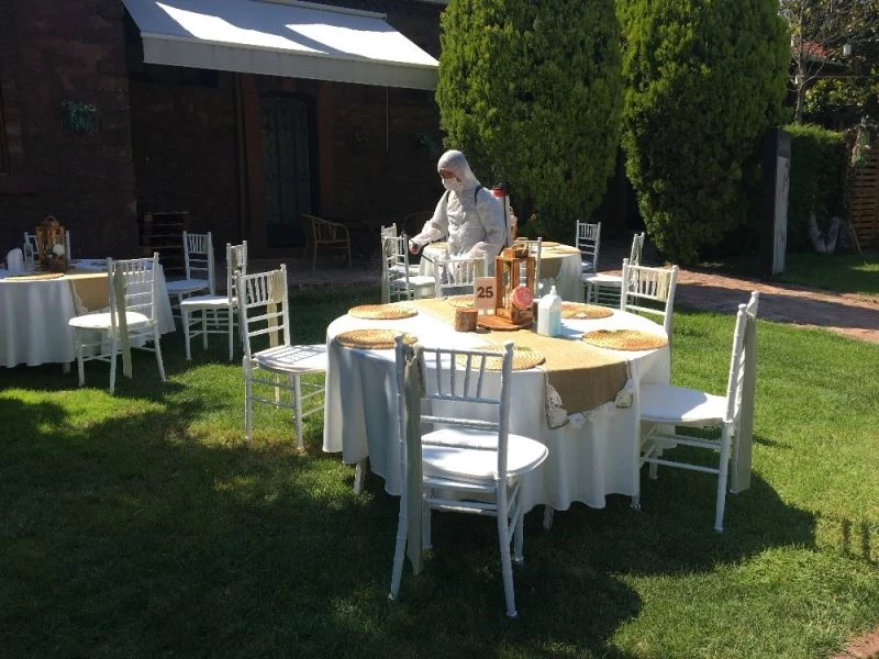 Düğün salonu işletmecisi Kazım Çarıklı, “Yarın ki düğüne hazırız. İçişleri Bakanlığı genelgesi doğrultusunda tüm broşürlerimiz, mesafe aralıkları çizgilerimiz, el dezenfektanlarımız, maske takma zorunluluğunu ibare eden broşürlerimiz, masalarda dezenfektanlarımızla hazırız. Sandalyelerimiz arasın 65 santimetre, masalarımız arası 1,5 metre olarak tüm önlemlerimizi aldık” dedi.