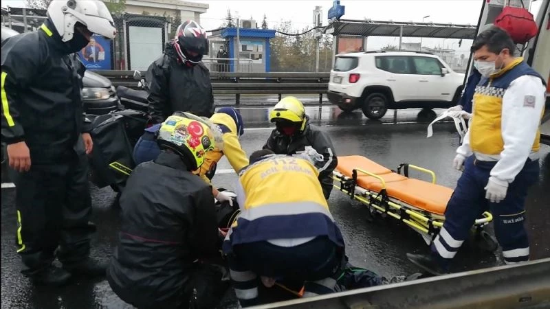 E-5 Karayolu Okmeydanı mevkisinde yoğun yağış nedeniyle kayan motosiklet sürücüsü yere savrularak yaralandı. Sürücü ambulansla hastaneye kaldırılırken, kaza nedeniyle karayolunda trafik yoğunluğu meydana geldi.