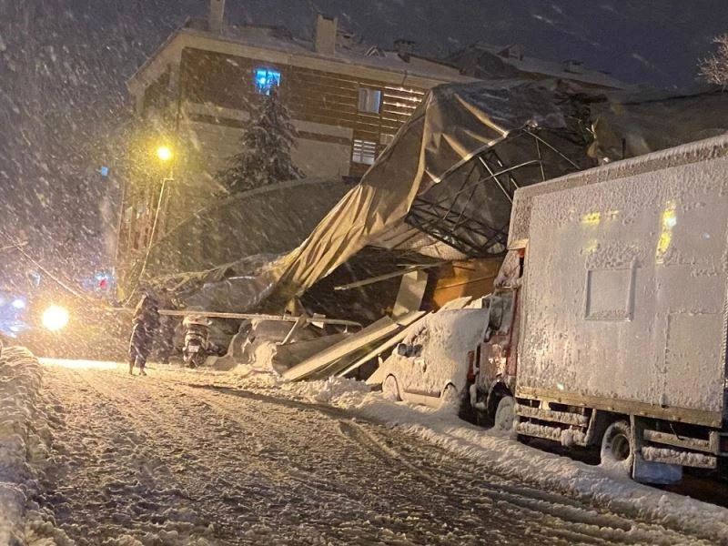 Eyüpsultan Göktürk’teki Ali Rıza Özderici Lisesi Spor Salonu çatısı üzerinde biriken kar kütlesinin ağırlığına dayanamayarak çöktü. Araçlar çöken çatının altında kalırken, çökme nedeniyle yol kenarındaki bir elektrik direği de devrildi.