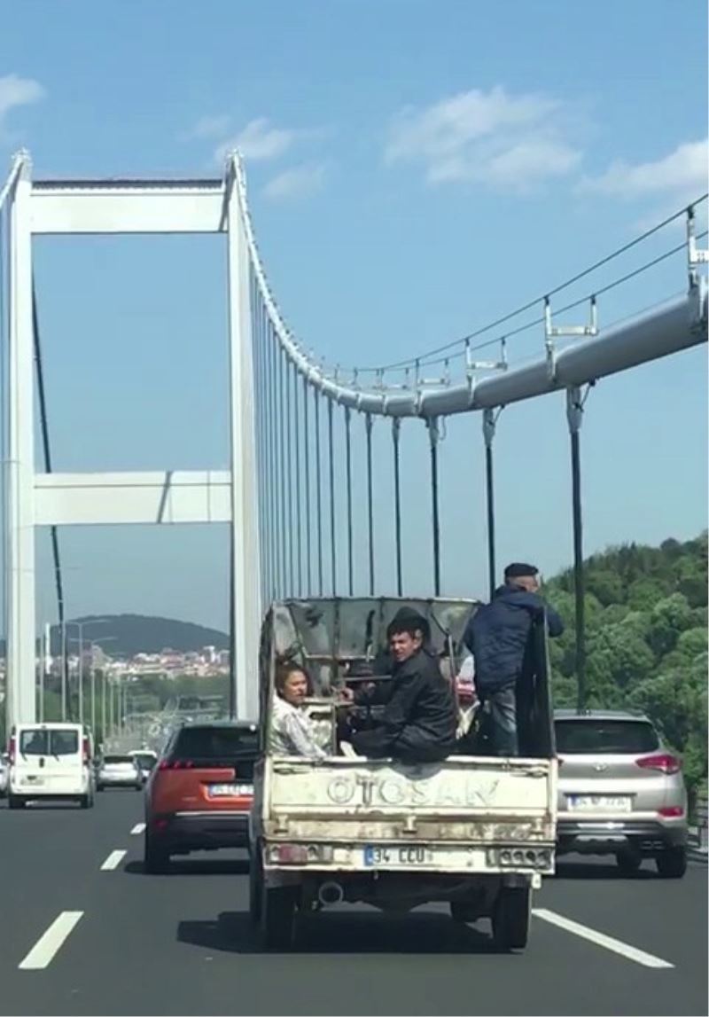 Fatih Sultan Köprüsü (FSM) Ankara istikametinde seyreden bir kamyonetin kasasında 5 çocuk yolculuk etti. Kamyonetin kasasında bulunan çocuklardan bir tanesinin kasanın kenarına oturması yürekleri ağza getirdi. 5 çocuğun yüzlerinde maske olmadığı ve sosyal mesafeye uymadığı görüldü. Köprü üzerinde şerit değiştirerek seyir eden kamyonetin plakasının son rakamlarının silinmiş olması ise dikkat çekti. Kasasında 5 çocuk ile tehlikeye davetiye çıkaran kamyonet sürücüsün duyarsız davranması akıllara durgunluk verdi.