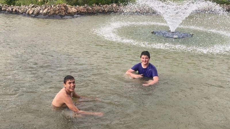Eskişehir’in Batıkent mahallesinde güneşli havanın bunaltıcı etkisinden kurtulmak için süs havuzuna giren 14 yaşındaki 2 genç arkadaş, öğleden sonra etkisini gösteren sağanak yağışa havuzda yakalandı. Şiddetli yağmura aldırış etmeyen Arda ve Oğuzhan isimli arkadaşlar, dakikalarca süs havuzunun içerisinde vakit geçirdi. Hem kıyafetli hem de kıyafetsiz olarak suya giren gençler, görenleri şaşkına çevirdi. Islanan kıyafetlerindeki suyu yağmur altında sıkmaya çalışan arkadaşların mutluluğu ise kameralara yansıdı. Hallerinden memnun olan gençler, eğlendiklerini ifade ederek, “Serinlemek için girdik. Sonra yağmur başladı. Böyle vücudumuzda çivi gibi olur. Havuz içi sıcak, dışarısı soğuk” diyerek hislerini anlattı.