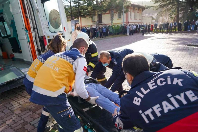 Bilecik Belediyesi binasında muhtemel bir deprem ve yangına karşı söndürme ve kurtarma tatbikatı gerçekleştirildi. Senaryo gereği bir kişi itfaiye yardımıyla camdan kurtarılırken, dumandan etkilenen bir kişiye de bina içinde müdahale edildi.