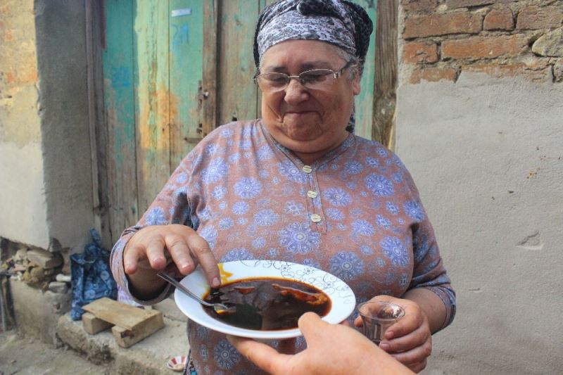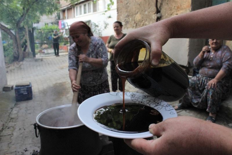 Bursa’da dutların olmasıyla birlikte köylerde kadınlar dut pekmezi yapmaya başladı. Köylü kadınlar doğal dut pekmezi yapmak için 2 gün ateşin başında ter döküyor.