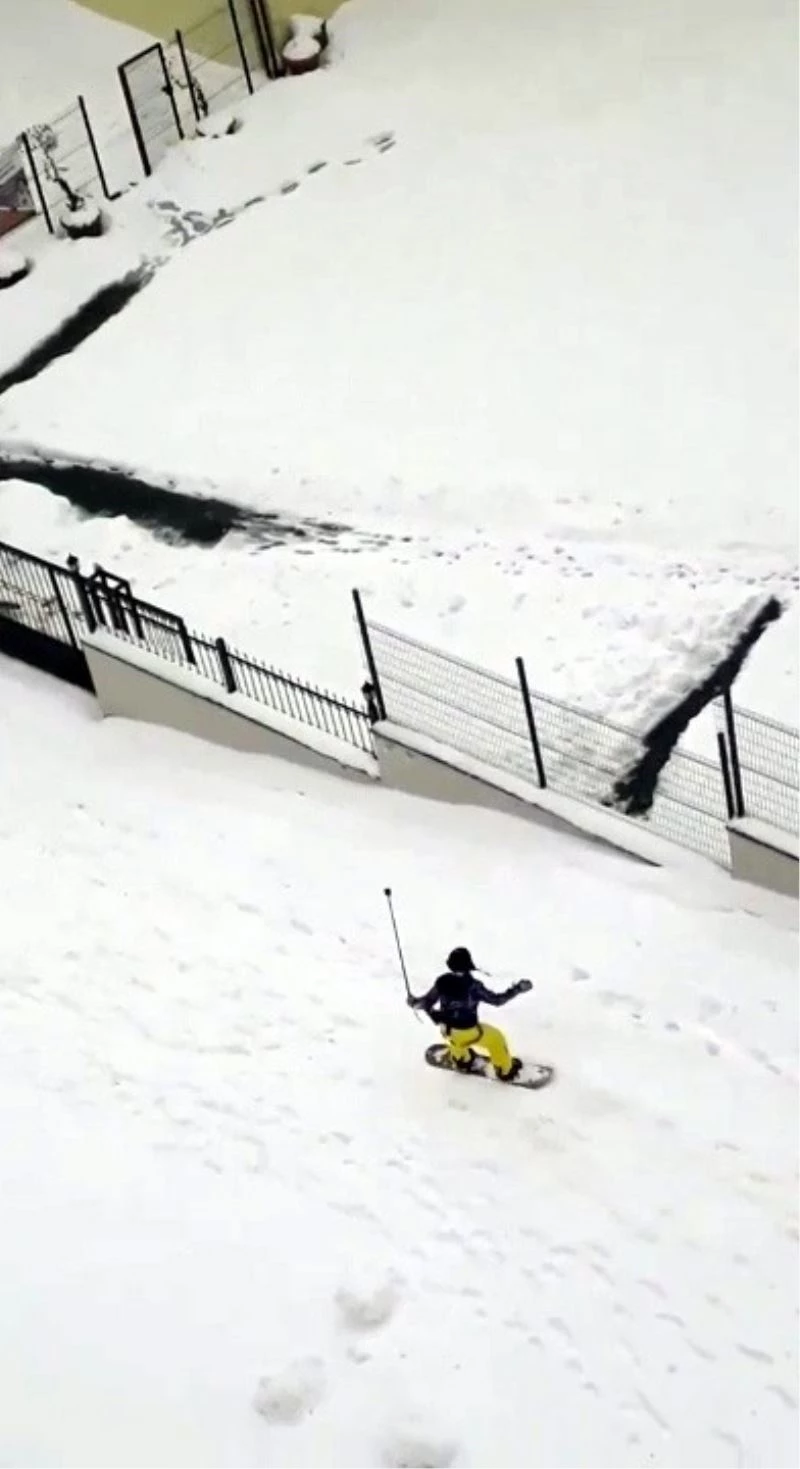 Sarıyer Emirgan’da ve Başakşehir’de kar yağışı sonrası snowboard tutkunu iki kişi, kayak pistindeymiş gibi kaydı. Karda snowboard keyfi cep telefonu kamerasına yansıdı.