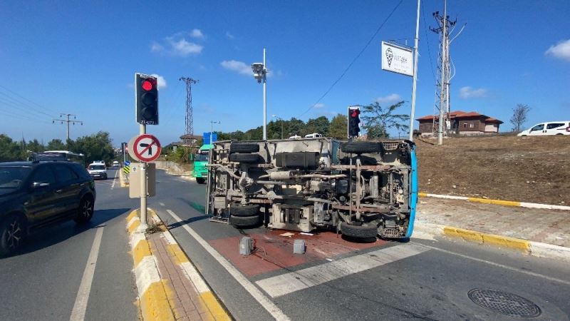 Sarıyer’de kırmızı ışığı görünce aniden frene basan sürücünün idaresindeki dondurma yüklü kamyonet devrilerek yan yattı. Kazada sürücü hafif şekilde yaralanırken, yol trafiğe kapandı.