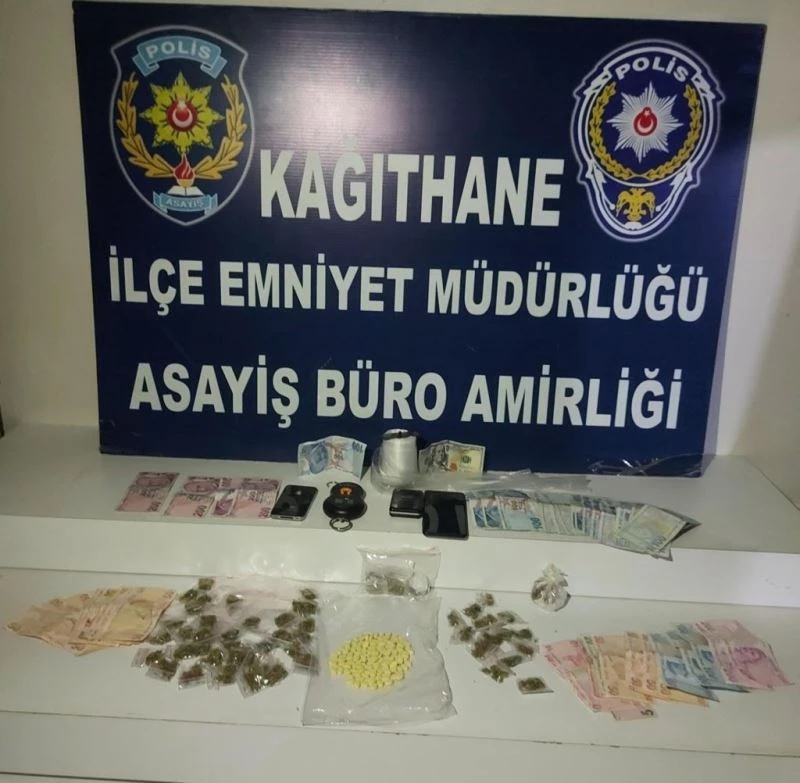 Edinilen bilgiye göre, Kağıthane İlçe Emniyet Müdürlüğü Asayiş Büro Amirliğine bağlı ekipler, uyuşturucu madde satışı yapıldığı ihbarı üzerine Hürriyet Mahallesi Gölbaşı Sokak’ta bir eve operasyon düzenledi. Operasyonda ev didik didik arandı. Yapılan aramalarda evin salon ve yatak odasında 35 parça 25 gram gelen marıjuana, 15 parça 16 gram gelen marıhuana, 3 parça halinde 9 gram gelen metanfetamin, 1 paça halinde poşet içerisinde 2.8 gram gelen marıhuana, 130 adet 58 gram gelen extazi, uyuşturucu ve uyarıcı madde tartımında kullanılan hassas terazi ele geçirildi. Şüpheli Erol K.’in üst aramasında ise 5 adet 3,2 gram gelen marıhuana, 2,15 gram gelen metanfetamin ve uyuşturucu madde ticaretinden elde ettiğini düşünülen 4 bin 800 lira ele geçirildi. "Kasten yaralama"dan sabıka kaydı olan ev sahibi Yılmaz S’nin uyuşturucu ve uyarıcı madde ticaretinden elde ettiğini düşünülen bin 15 liraya da el konuldu. "Kasten yaralama", "terör örgütüne üye olma" suçlarından sabıka kaydı bulunan Erol K. ile Yılmaz S.ve baskın sırasında evde bulunan Yunus T., Ümit A. isimli şahıslar gözaltına alındı.
