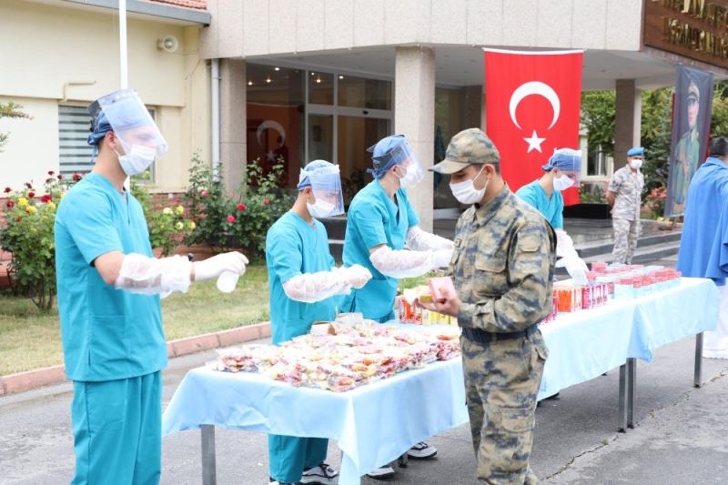 Konuşmanın ardından üs komutanı Albay Kanbur, görevli rütbeli personel ile er ve erbaşların sırayla bayramlarını kutladı. Korona virüs nedeniyle sosyal mesafe ve maske kurallarının uyulduğu törende, askerlere bayram şekeri, tatlı ve kolonya ikramında bulunuldu.