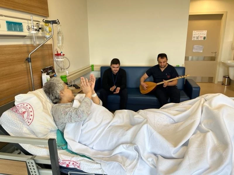 Eskişehir Şehir Hastanesi’nde kanser tedavisi gören Nurhan Altuk, Üroloji Uzmanı Doç. Dr. Coşkun Kaya’nın çaldığı bağlama ve müzik öğretmeni olan oğlu Oğuzhan Mert’in söylediği şarkılarda moral buluyor.