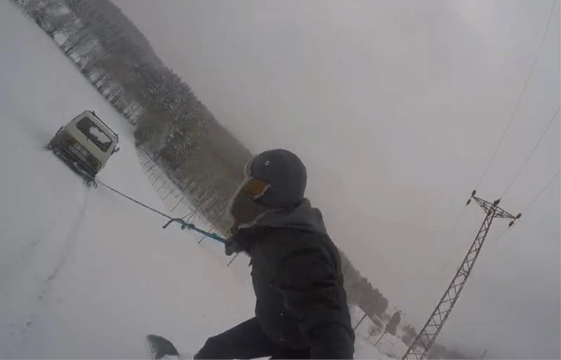 Bursa’nın İznik ilçesindeki dağ köylerinde kar 2 metreyi buldu. Köy yolunda araç arkasına iple tutunarak snowboard yapan gençlerin görüntüsü ilgiyle izlendi.