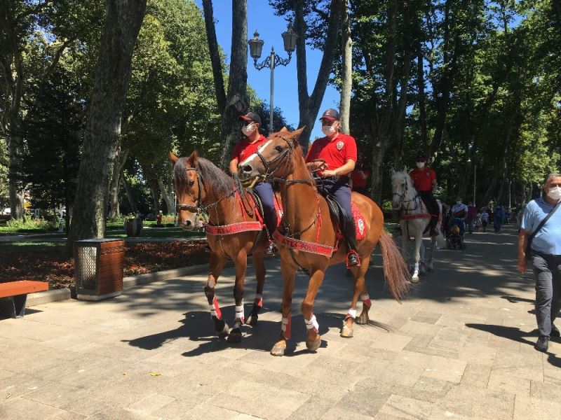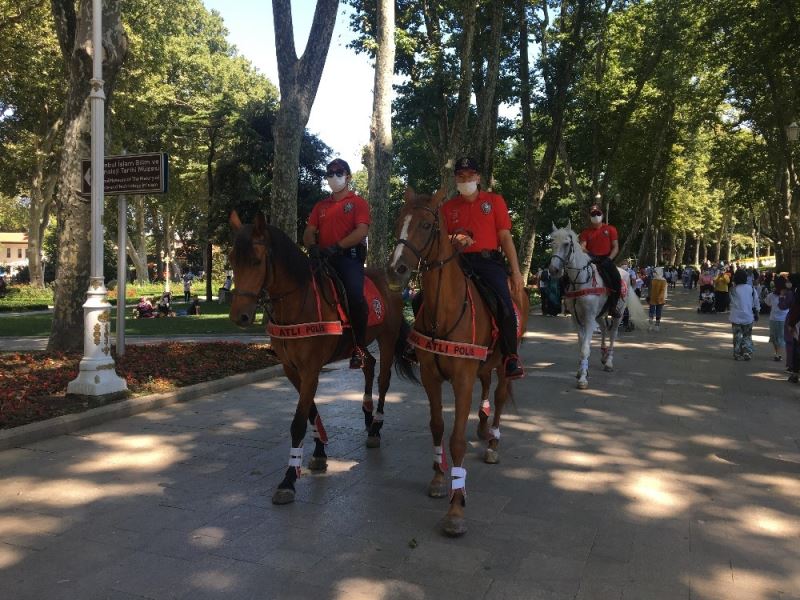 Kurban Bayramı’nın üçüncü gününde atlı polisler, Gülhane Parkı’nda korona virüs tedbirleri kapsamında denetim gerçekleştirdi. Vatandaşlara sosyal mesafeyi korumaları ve maske kullanmaları yönünde uyarılarda bulunan atlı polis birlikleri, çevredeki vatandaşların ve çocukların ilgi odağı oldu. Vatandaşlar, atlı polis birlikleriyle fotoğraf çekildi. İstanbul’un sahillerinde, turistik ve tarihi noktalarında devriye gezen atlı polis birliklerinin denetimlere devam edeceği öğrenildi.