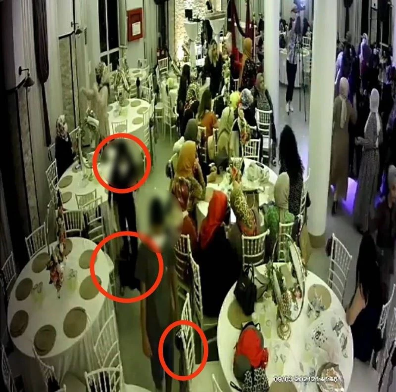 Olay, merkez Yıldırım ilçesi Yeşilyayla Mahallesi’nde bulunan bir düğün salonunda meydana geldi. İş yerinin güvenlik kamerasına yansıyan görüntülerde ise, herkesin sahnede oynadığı sırada salona giren hırsızlar önce bir masanın yanına giderek oynamaya başladı. O sırada sandalyede asılı olan ve üzerinde duran iki çantayı alan hırsızlar tekrardan oynayarak salondan çıktığı görüldü.