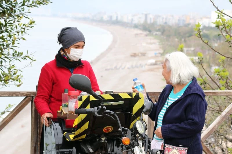 Antalya’da pandemi döneminde ekonomik zorluk çeken aile komşularının hediye ettiği bisikleti ekmek kapısı yaptı. Eşi iş yerini kapatan iki çocuk annesi kadın, eve kapanmak yerine her gün sabah 20 dakika yol kat ederek Antalya’nın dünyaca ünlü falezlerinin kenarında turistlere çay ve kahve satarak para kazanıyor.