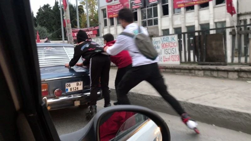 Olay, dün akşam saatlerinde Eyüpsultan Rami Kışla Caddesi üzerinde meydana geldi. Cadde üzerinde seyir halinde olan bir otomobile tutunan patenli 3 genç tehlikeye aldırış etmeyen yolculuk yaptı. Patenli gençlerin tehlikeli yolculuğunu gören bir vatandaş ise ‘tehlikeli değil mi’ diye sorarken gençler, aldırış etmedi. Bir süre otomobile tutunarak devam eden gençler otomobilin yavaşlamasının ardından kaldırıma çıkarak yollarına devam etti.