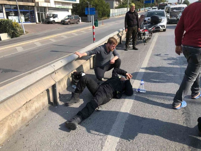 İstanbul Pendik D-100 Karayolu’nda ticari taksi sürücüsü yolda park halinde bulunan motosiklete çarptı. Motosiklet sürücüsü çarpmanın etkisiyle birden fazla takla attı.