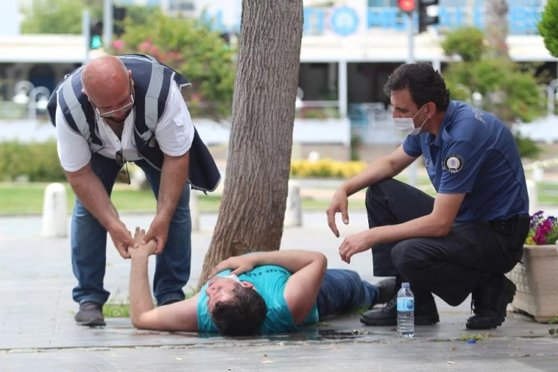 Antalya’da Konyaaltı Sahili’ne yakın noktada fenalaşarak yere düşen gencin yardımına sabit görevdeki polis ekipleri koştu. Polis yan yatırdığı gence su döktü, bileklerine masaj yaptı.