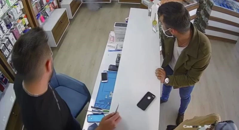 Bayburt’ta telefon teknik servisinde şişen bataryanın telefoncunun elinde patlaması güvenlik kameralarına yansıdı.