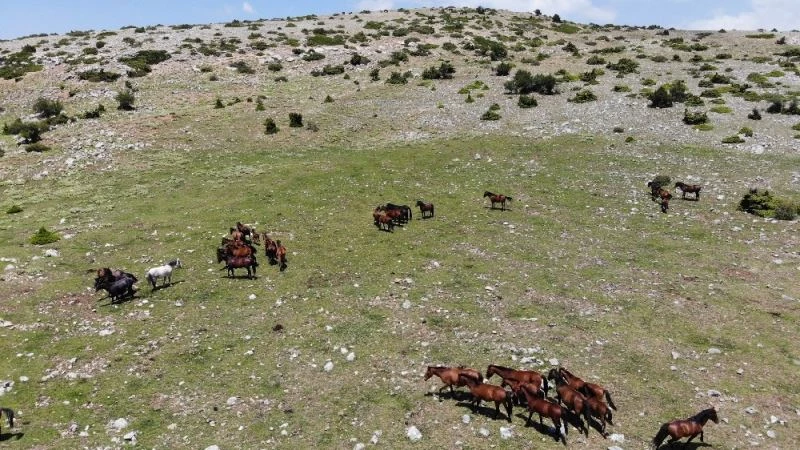 Manisa Spil Dağı Milli Parkı sınırları içerisinde koruma altında bulunan yılkı atları doğal yaşam alanlarında havadan görüntülendi. Yılkı atlarının toplu halde hareketleri güzel görüntüler oluşturdu.