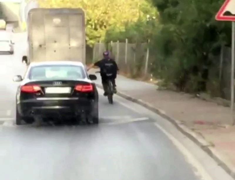 Sultangazi Esentepe Mahallesi Lütfi Aykaç Bulvarı üzerinde bisikletiyle akan trafikte ilerleyen bir kişinin tehlikeli yolculuğu kameraya yansıdı. Yürekleri ağza getiren görüntülerde, bisikletli bir kişinin kamyonetin arkasına tutunarak ilerlediği görülüyor. Arkadan gelen sürücülerin kendisini uyarmak için çaldıkları korna seslerine de aldırış etmeden devam eden yolculuk bir süre sonra aracın Gaziosmanpaşa istikametine yönelmesi ve kameranın kayıttan çıkması ile sona eriyor.