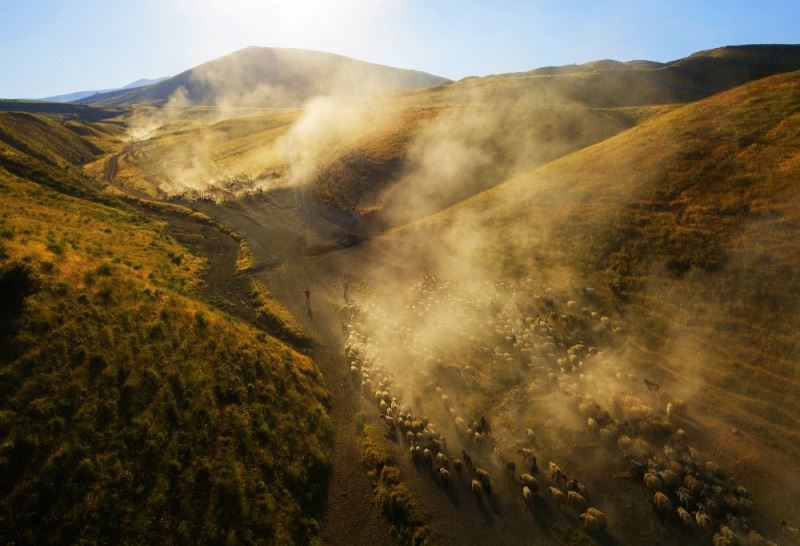 Koyun sürülerinin tozlu yol ve vadilerden geçişiyle beraber ortaya çıkan görüntüler havadan drone ile görüntülendi.
