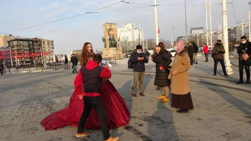 Bir markanın katalog çekimi için Taksim Meydanı’nda poz veren Rus model yoğun ilgi gördü. Vatandaşlar ve turistler, kırmızı bir gelinlikle meydanda dolaşan modelle bol bol fotoğraf çektirdi.