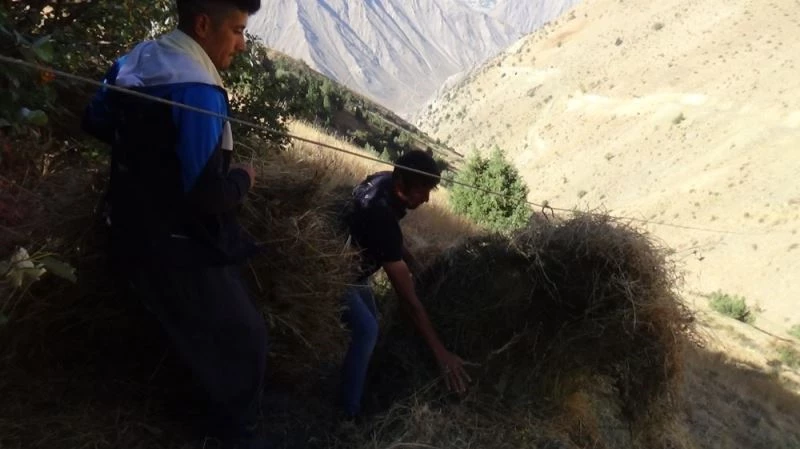 Yazın dağlarda biçip istifledikleri otların kolay taşınabilmesi için çelik halattan teleferik yaptığını ifade eden besici Yunus Tertemiz, teleferiğin kalan son 20 balyanın ağırlığa dayanamayıp sabitlendiği yerden ayrıldığını söyledi. Köyde tek geçim kaynaklarının hayvancılık olduğunu anımsatan Tertemiz, “Köyde 70 küçükbaş hayvanım var. Hayvanlarımız kışın aç kalmasın diye bu engebeli dağlarda yaz aylarında bin bir zorlukla ot biçtik. Vadinin karşısında yaklaşık bin balya ot biçtik. Ot balyalarını kış aylarına bırakmak istemedik. Çünkü eskiden yol yoktu. Kızaklarla gelip alırdık. Tabi tehlikeliydi ve çığ tehlikesi vardı. Şimdi belli bir yere kadar yol gidiyor. Vadinin öteki ucunda bin balya ot biçmişim. Ben bu balyaları köye götürmek için işçi tutsaydım maliyeti beni kurtarmazdı. Kendim de taşısaydım bir ayda ancak taşırdım. Bir gece abilerime danıştım. Çelik halatım var. Teleferik yapacağım dedim. Bana inanmadılar. Bunun imkansız olduğunu söylediler. Bende halatımı getirdim. Amcaoğlumun yardımıyla halatımızı karşı vadideki bir çam ağacının köküne bağladık. Yola da bir kazık çaktım. Ot balyalarını yaptığım kancalarla çelik halattan kaydırarak indirmeyi başardım. Balyalarımı ikişer veya üçer indirdim. Bin balyanın hepsini 40 dakikada indirdim. Sırtımda bu mesafede taşımış olsaydım bir ayda bile bitiremezdim. Tabi balyalarımın son 20 tanesi kalmıştı ki halatın bağlı olduğu kazık yerinden çıktı. Çok şükür bir kazaya neden olmadı. Geri kalanları sırtımda taşıyacağım. Tabi seneye kazığı betonla güçlendirip halatı yerinde sabitleyeceğim. Çünkü seneye de lazım olacak. Komşu köyler bu icadımı görünce şaşırdılar. Şimdi hepsi köylerine gidip onlar içinde yapmamı istiyor. Yarın aracı getirip balyaları köye götüreceğim. Kışın hayvanlarım aç kalmayacak” diye konuştu.