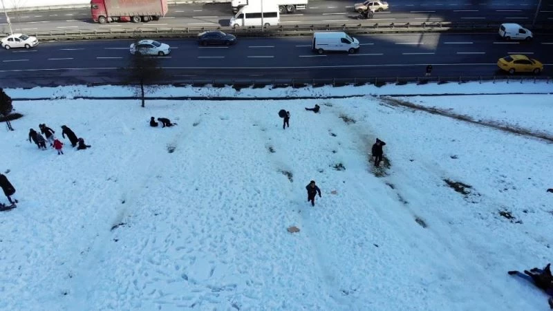 Esenyurt’ta TEM bağlantı yolu kenarında çim alan üzerinde biriken karların üzerinde kayan çocukların tehlikeli oyunu havadan görüntülendi.