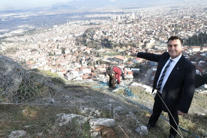 10 bin metrekarelik kayalık alanda tedbir aldıklarını belirten Osmangazi Belediye Başkanı Mustafa Dündar, "Altıgen çelik telle bu bölgeyi kaplıyoruz. Herhangi bir harekette taşların buradan kopması halinde bu tel kayaları engelleyip aşağıya vatandaşların evlerine gitmesine engel olacak. Dağ yamaçlarında yapılan bu çalışmayı dağcılar yapıyor. Herkesin yapabileceği bir iş değil. Bizler çelik tellerle bu bölgeyi sağlamlaştırıp kayaların aşağıya inmesini engelliyoruz" dedi.