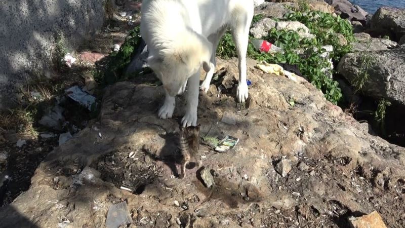 Maltepe sahilinde geçtiğimiz günlerde kaydedilen görüntülerde, kayalıklarda bulunan ve annesi tarafından terk edildiği düşünülen yavru kediye bir sokak köpeğinin arkadaşlık ettiği görüldü. Yavru kedi ile sokak köpeğinin eğlenceli oyunun görenleri gülümsetti. Soka köpeğinin ise ara sıra yavru kediden korktuğu görüldü. Yavru kedi ile köpeğin eğlenceli oyunu kameraya böyle yansıdı.