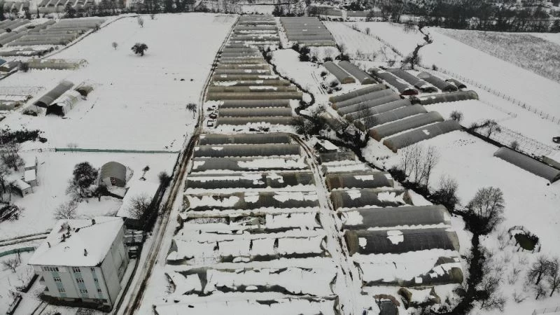Göçbeyli köyünde çatılarda biriken yoğun kar nedeniyle çöken seralar drone ile havadan görüntülendi.