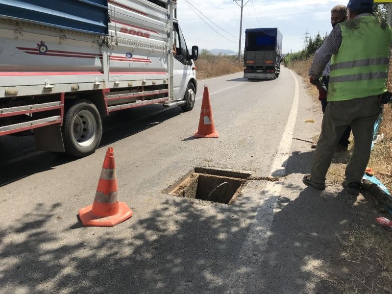 Bursa’da hırsızlar tek şeritli yoldaki rögar kapaklarını çaldı. Çocuk mezarı büyüklüğündeki üstü açık çukur, sürücüleri ölümle burun buruna getiriyor.