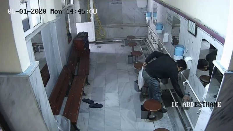 Hırsızlık anı güvenlik kameraları tarafından saniye saniye kaydedildi. Görüntülerde, şüpheli şahsın elinde ekmek poşetiyle abdesthaneye girdiği, önce muslukları kontrol ettiği, ardından musluğu ayağıyla kırarak poşetin içine koyduğu görülüyor. Kapıya doğru gidip etrafı kontrol eden şahsın, daha sonra diğer muslukları da aynı şekilde kırarak poşete koyduğu ve poşeti bağlayarak camiden ayrıldığı yer alıyor. Maske takan şüphelinin aynaya bakarak saçlarını düzeltmesi ve rahat tavırları ise dikkat çekiyor.