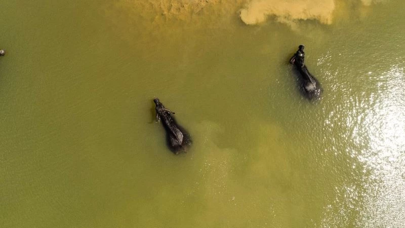 İstanbul Arnavutköy’de bir gölette mandaların suya girip serinlediği anlar, belgesel görüntülerini aratmadı. Kış aylarını ahırlarda geçiren, ilkbaharın gelmesi ve havaların ısınmasıyla meralara salınmaya başlanan manda sürüleri Arnavutköy’de bulunan bir gölette suyun keyfini çıkardı. İstanbul’da hava sıcaklığının artması ile kendilerini suya bırakan mandaların görüntüsü Afrika’yı aratmadı. Mandaların suyun üzerinde mutlu oldukları gözlemlenirken görünen manzara ise ‘Afrika Savanası’nı hatırlattı. Görüntülerde manda sürüsün adeta suyun üzerine süzüldüğü görülüyor.