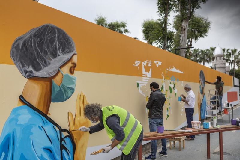 Ekipler, yeni tip koronavirüsle (Kovid-19) mücadele sürecine dikkati çekmek için de saglik çalisanlarini yansitan resimler çizdi.