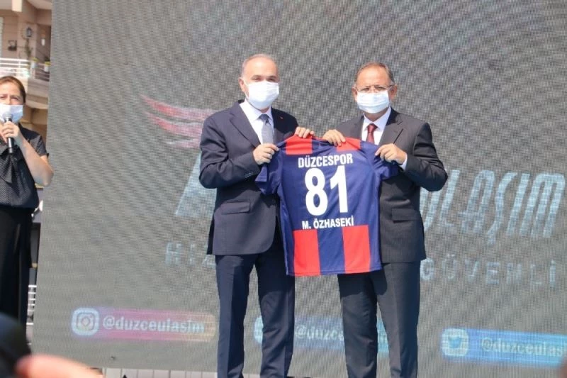 AK Parti Genel Başkan Yardımcısı Yerel Yönetimler Başkanı Mehmet Özhaseki bir takım açılışlar ve etkinler için Düzce’ye geldi. Düzce Belediyesi tarafından hayata geçirilen yeni ulaşım sistemine dahil olan 100 araçlık yeni ulaşım araçları filosunun devreye alınacağı törene de katılan Özhaseki’ye Belediye Başkanı Dr. Faruk Özlü, 81 numaralı adının yazı olduğu Düzcespor forması hediye etti.