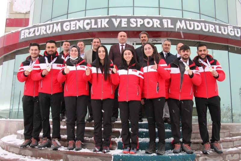 Norveç’in Lillehammer Kentinde yapılan Avrupa Curling Şampiyonası’nda tarih yazan Kadın ve Erkek Milli takımımız Erzurum GSİM’deydi. Türkiye Curling Federasyonu Başkanı Prof. Dr. Kenan Şebin, Başkanvekilleri Ahmet Çelebi, Murat Akın, yönetim kurulu üyeleri Güngör Şenses, Levent Çakmur, Erkek Milli Takımı Antrenörü Ahmet Çelik ile Avrupa’da tarih yazan milli curlingçileri kabul eden Gençlik ve Spor İl Müdürü Birdal Öztürk, Avrupa Fatihlerini başarılarından ötürü tebrik ederek dünya şampiyonası ve Olimpiyat Elemeleri öncesinde başarı dileklerini iletti.